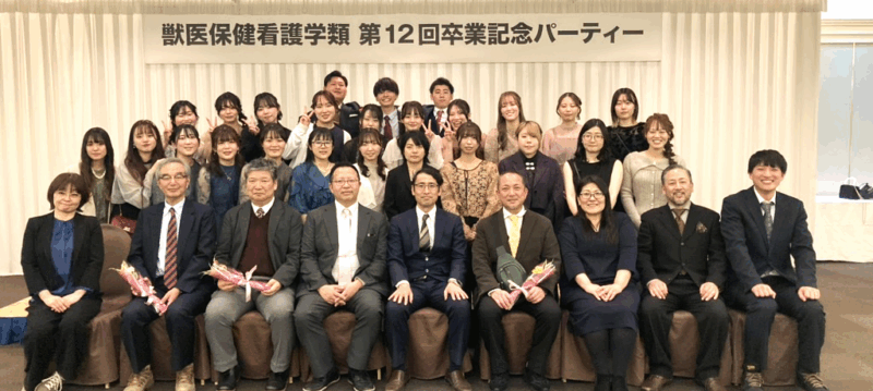 獣医保健看護学類第12回卒業記念パーティー実施報告 Date:2026.03.23 2026年3月19日(木)18:00〜20:00ホテルエミシア札幌2Fパステルにて、獣医保健看護学類第12回卒業記念パーティーを執り行った。 卒業生25名、教員9名、計34名が参加した。まず、林学類長より乾杯の挨拶があり、歓談し、各教員への花束と記念品の贈呈、各教員からの一言のあと、参加者全員で酪農讃歌を斉唱し、記念撮影を行った。心温かな会となった。(獣医保健看護学類 准教授 宮庄 拓) 次の記事へ 記事一覧へ 前の記事へ